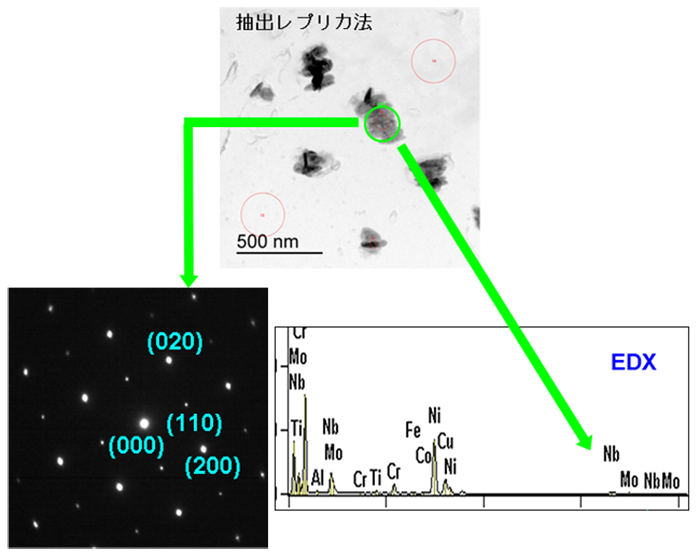 薄膜法により母相と析出物の関係の解析でき、抽出レプリカ法により析出物だけの解析が可能です。