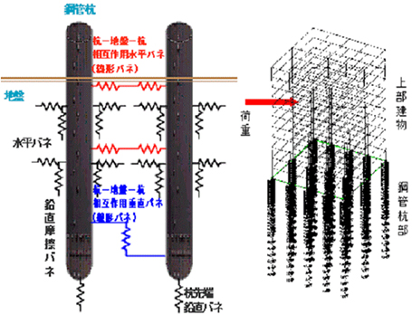 複数の鋼管杭の効果を考慮したビルの構造解析です。