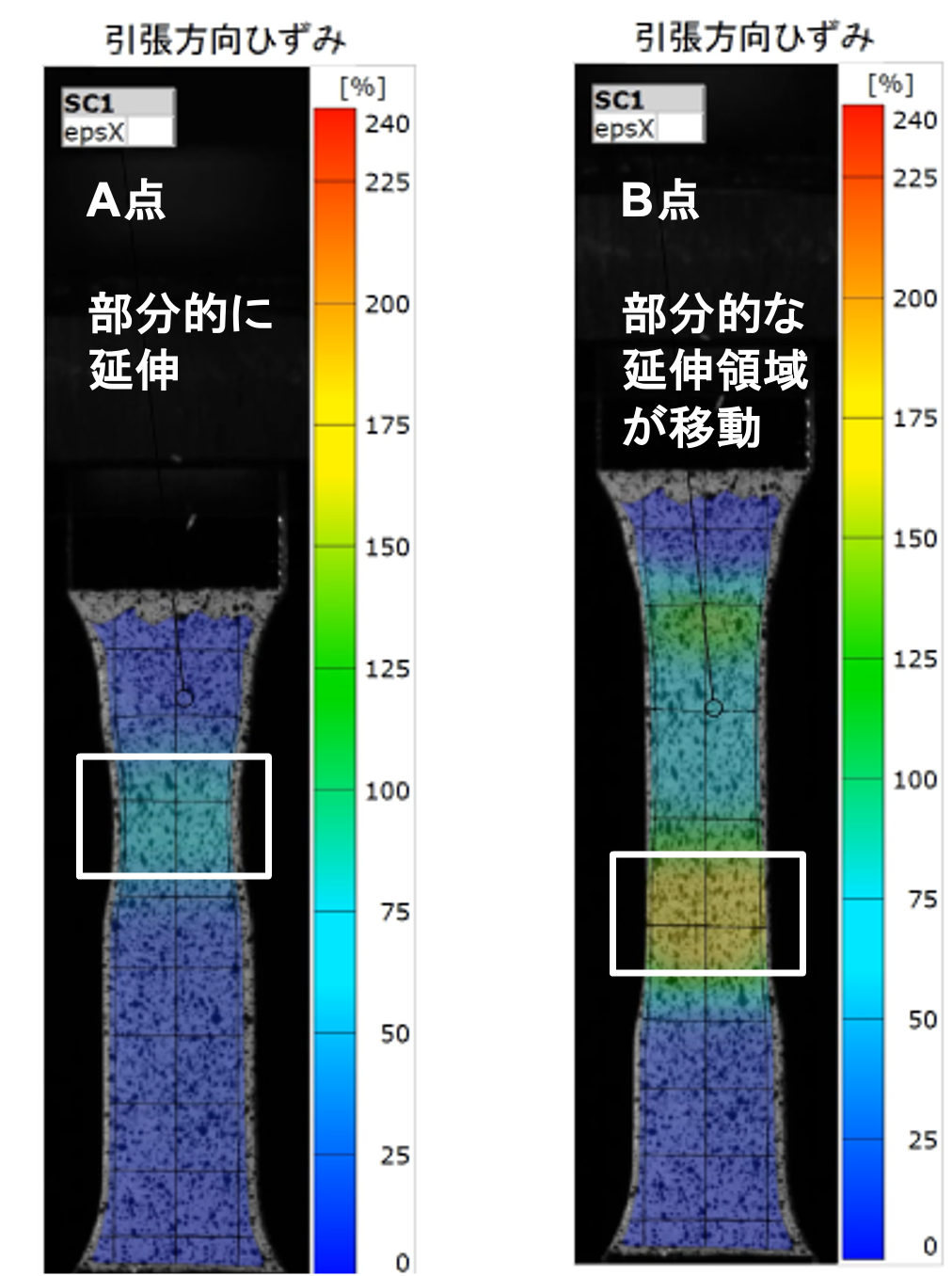DICを用いて引張ネッキング現象を可視化し評価します。