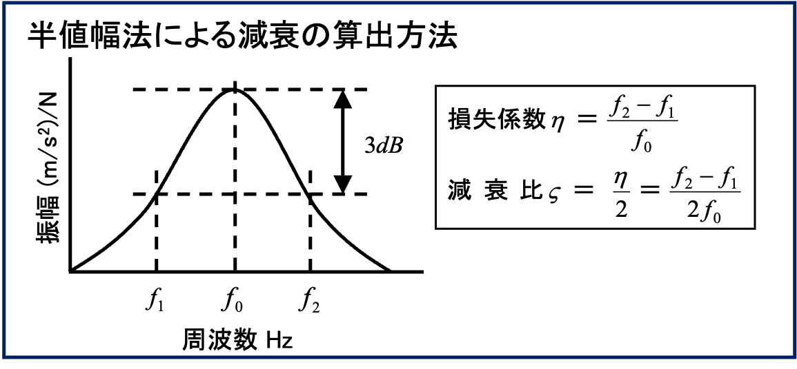 振動減衰値(損失係数、減衰比)は、この共振周波数に対して半値幅法等を適用することで求めることができます。 -