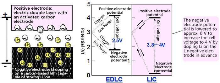 LIC is a next-generation electric storage device that achieves both a high operating voltage (high power) and high energy density by using Li pre-doped on the negative electrode.