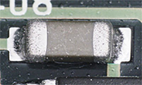 As the examination result of the cross section of the chip capacitor, it was found that the portion between the internal electrodes was short-circuited. As stress over the withstand voltage is not applied to this chip capacitor, and the failure is dependent on the lot of the chip capacitor. Therefore, it is presumed that the short-circuit was caused by a poor insulation between the internal electrodes.